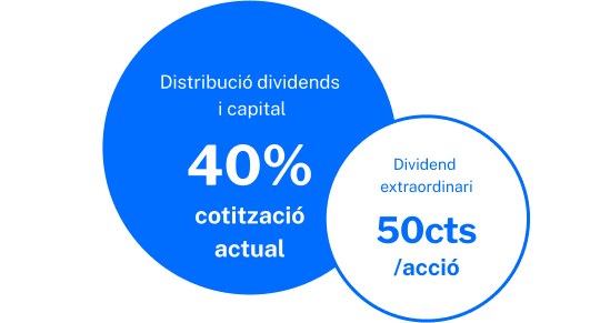 Entre el 2025 i 2027 Banc Sabadell espera realitzar distribucions de dividends i recompres d’accions als seus accionistes al voltant d’un 40 % de la cotització actual, inclòs un dividend extraordinari en efectiu de 50 cèntims d’euro per acció vinculat a la venda de TSB que s’abonarà previsiblement durant el primer trimestre de 2026.3