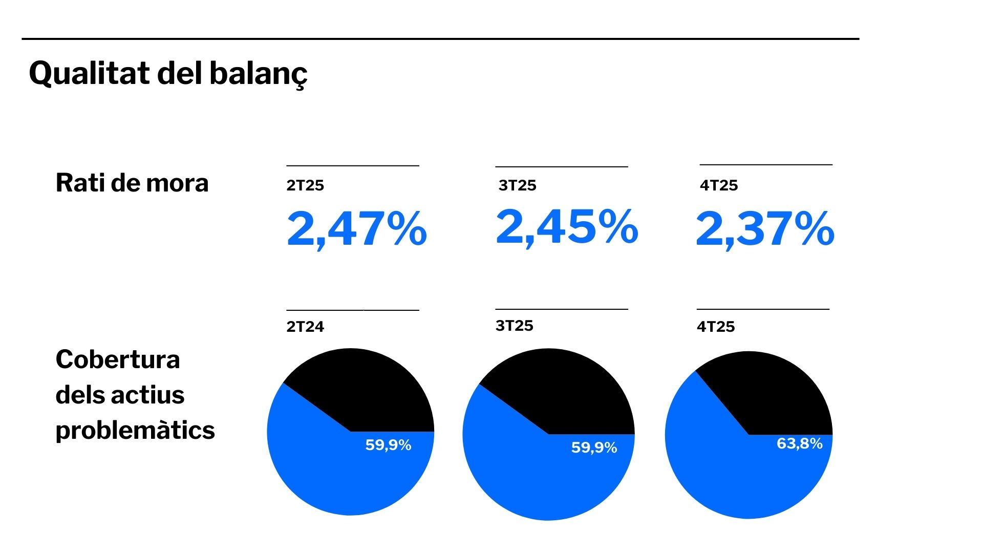 Pel que fa a la qualitat del balanç, la ràtio de morositat del Grup millora fins al 2,37%, mentre que la ràtio de cobertura stage 3 amb el total de provisions s’incrementa fins al 63,8%. A nivell exTSB, s’observa la mateixa tendència: la ràtio de morositat baixa fins al 2,65% i la ràtio de cobertura stage 3 puja fins al 69,5%.