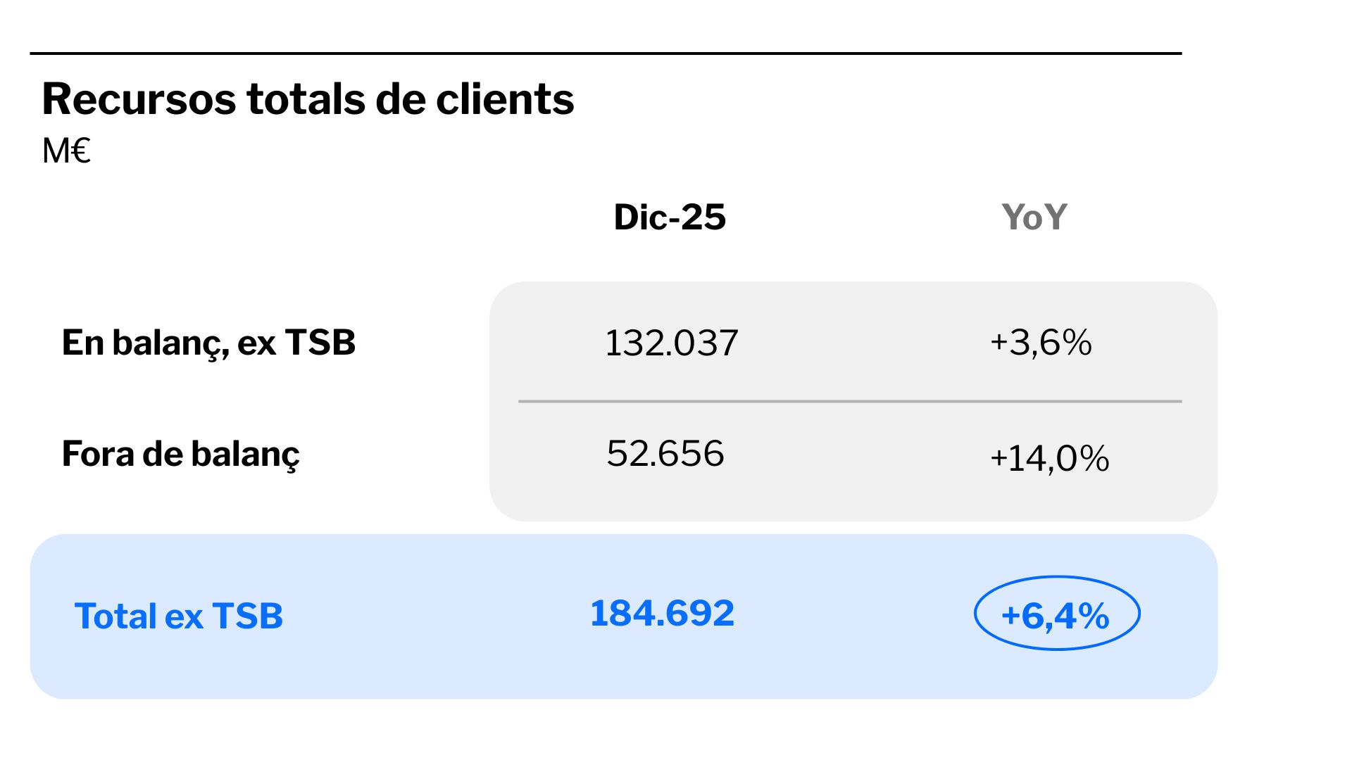 Atesa la partida del passiu, el total de recursos de clients exTSB ascendeix a 184.692 milions d’euros a tancament de desembre de 2025, cosa que representa un increment del 6,4% interanual. En el conjunt del Grup, els recursos de clients sumen 224.921 milions d’euros, un 4,3% més.