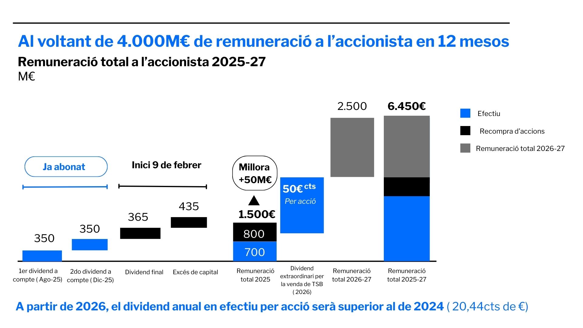 - L’entitat retribuirà els seus accionistes amb 4.000 milions en 12 mesos: 700 milions en efectiu a compte de l’exercici 2025 ja distribuïts, 800 milions en recompres que començaran el 9 de febrer i 50 cèntims per acció del dividend extraordinari de TSB