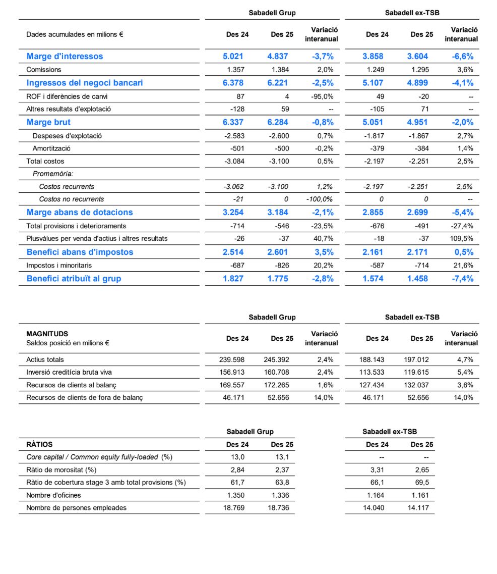 En la línia de resultats, Banc Sabadell ha reportat uns ingressos del negoci bancari (marge d’interessos més comissions netes) de 6.221 milions d’euros en el conjunt de 2025 (-2,5%). El marge d’interessos s’ha situat en 4.837 milions d’euros, cosa que representa una reducció interanual del 3,7%, en línia amb el que s’esperava principalment pels menors tipus d’interès.
