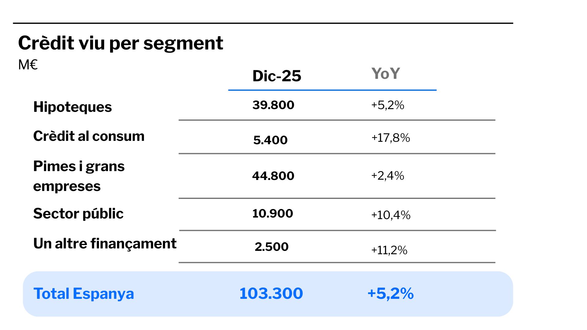 A Espanya, el crèdit viu d’hipoteques va augmentar un 5,2% interanual, fins a situar-se en 39.800 milions d’euros. Per la seva banda, el crèdit al consum va ascendir fins als 5.400 milions d’euros, cosa que representa un creixement interanual del 17,8% de la cartera total viva.