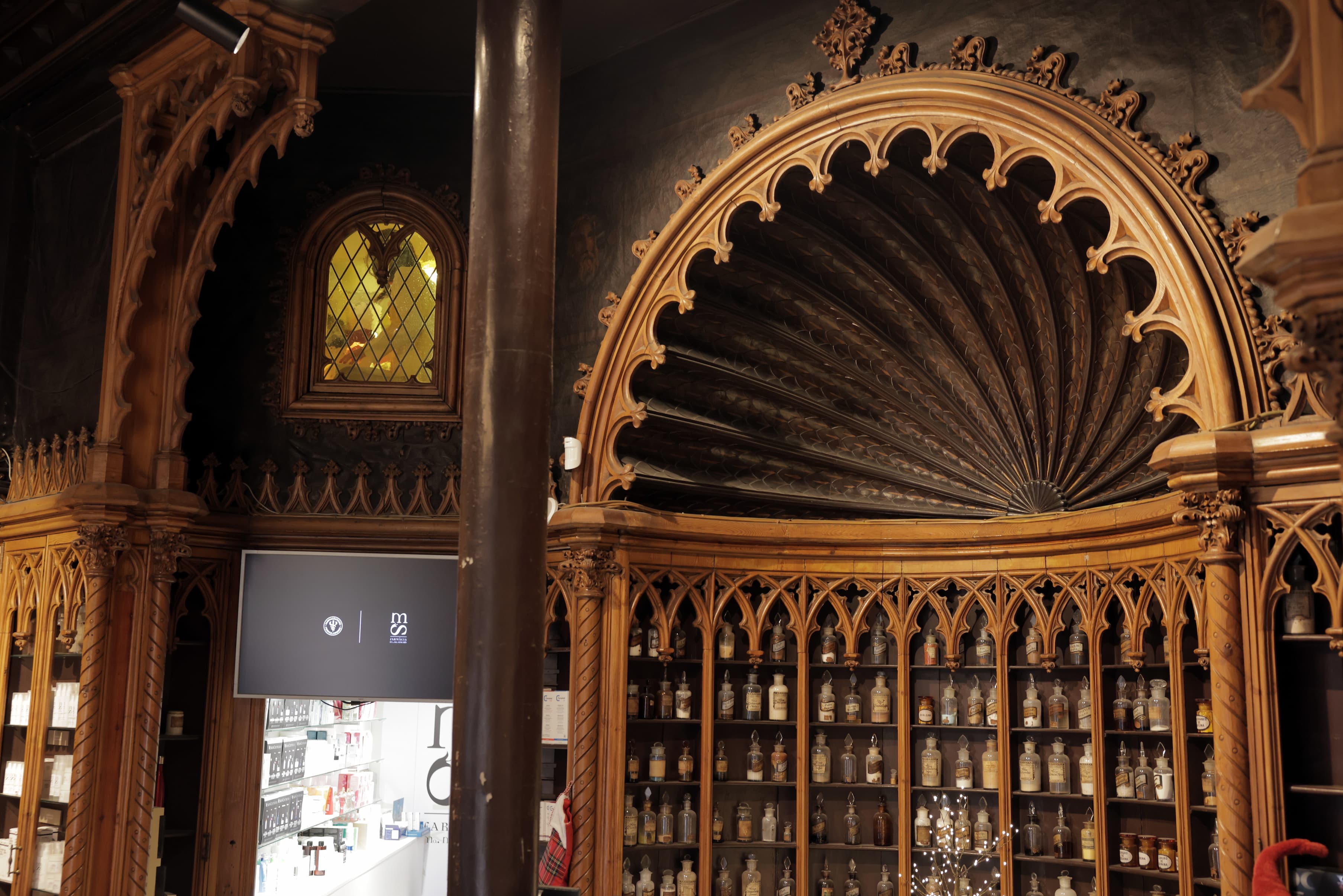 “Mi lugar favorito es la cúpula. La gente lo confunde con una iglesia”, manifiesta María Del Mar Sanchís, actual propietaria del negocio. Bajo el techo del ábside, pintado de plumas de pavo real, las antiguas estanterías de madera resguardan decenas de frascos de principios de siglo. Cicuta, Kaolin, Cremor Tártaro, Óxido de blanco de antimonio… Sustancias que los dueños de esta farmacia usaron hace más de un siglo y que aún se conservan bajo los arcos ojivales del mueble. Ahora, se mezclan con cajas de Frenadol, Fisiocrem y otros productos desarrollados en el laboratorio.