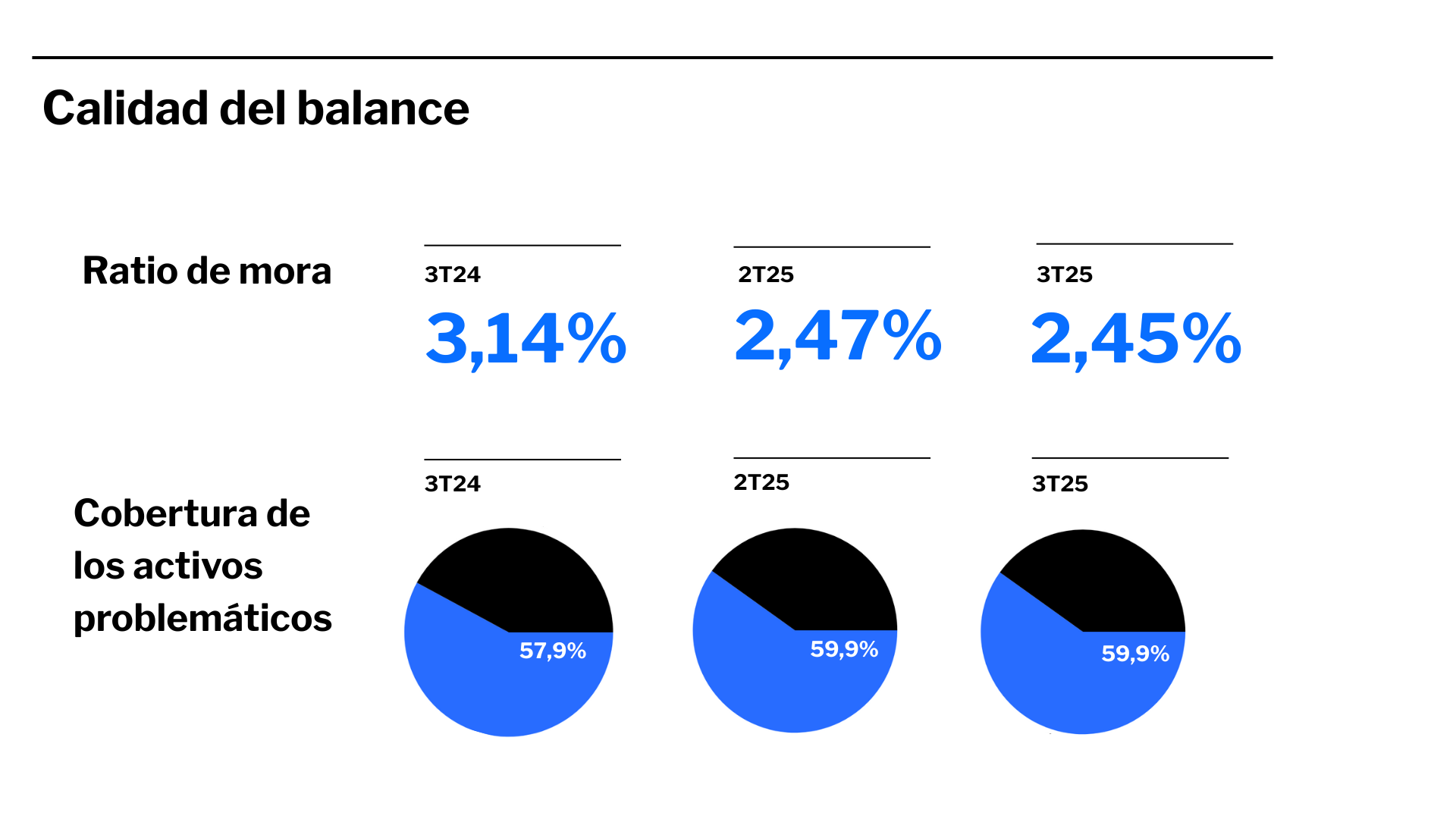 En términos de calidad de balance, la ratio de morosidad del Grupo mejora hasta el 2,45%, mientras que la ratio de cobertura stage 3 con el total de provisiones se incrementa hasta el 63,8%.>A nivel exTSB, la ratio de morosidad baja hasta el 2,75%, mientras que la ratio de cobertura >stage 3 con el total de provisiones sube hasta el 69,3%.