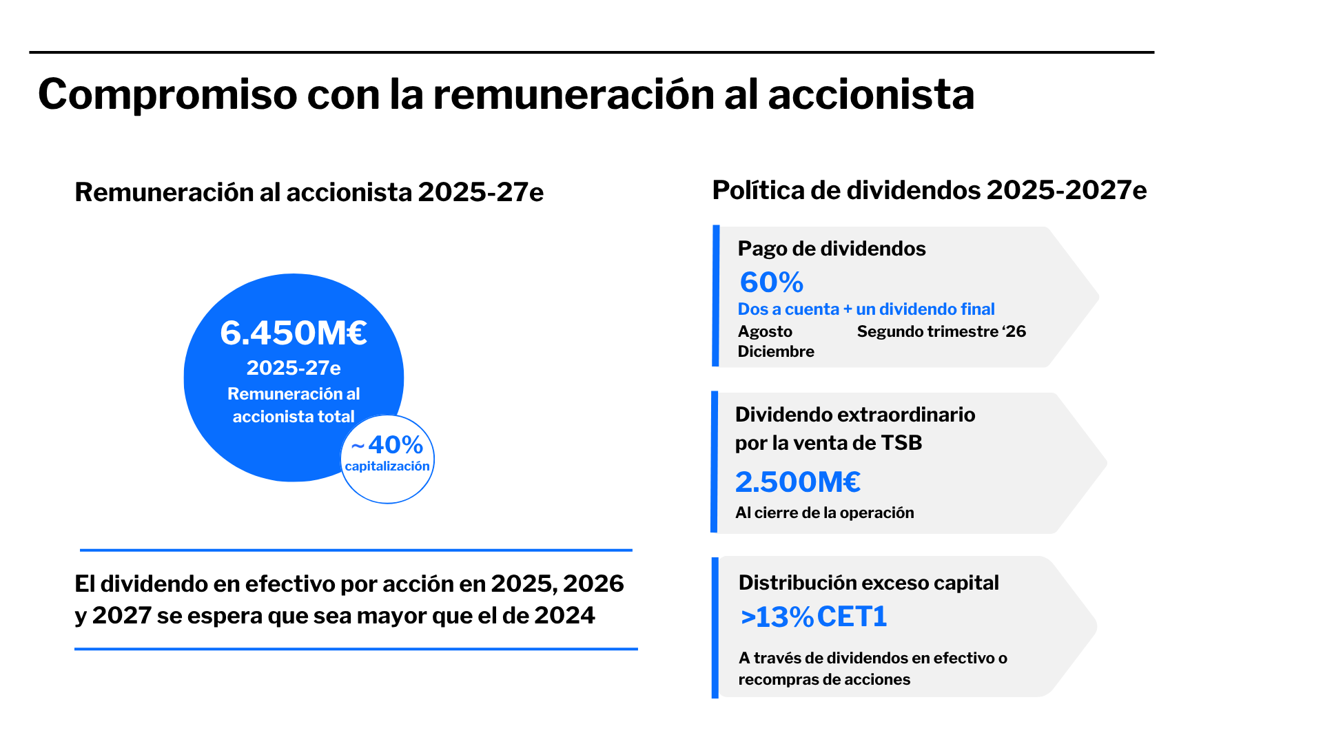 A esta distribución se le ha de sumar el dividendo extraordinario por importe de 2.500 millones de euros que se repartirá una vez se complete la venta de TSB en los primeros meses de 2026, así como el dividendo complementario y la distribución del exceso de capital con cargo al resultado final del ejercicio actual. Los programas de recompras de acciones seguirán utilizándose como herramienta de distribución de capital.