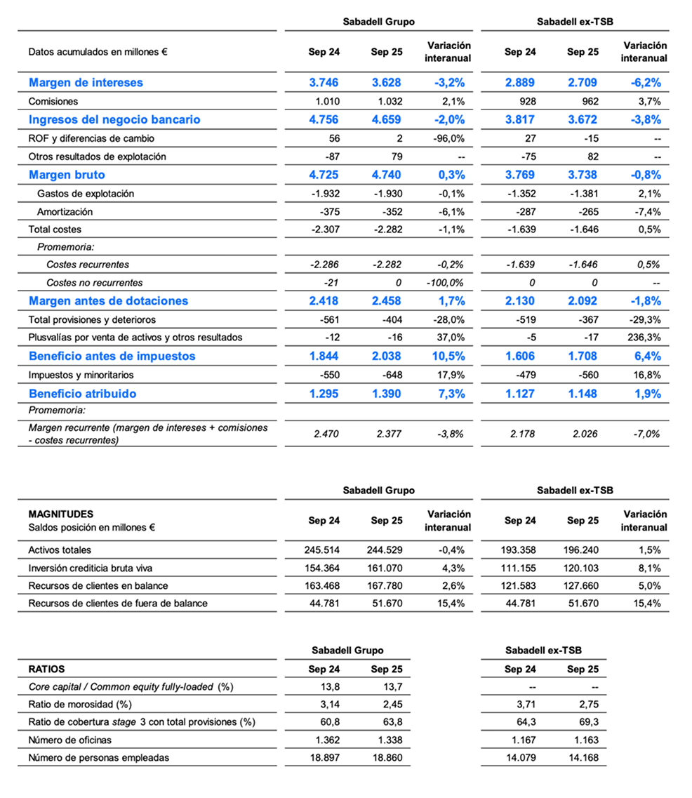 El Grupo Banco Sabadell ha logrado un beneficio neto de 1.390 millones de euros en los nueve primeros meses de 2025, lo que representa un incremento del 7,3% interanual y, además, supone un nuevo resultado récord para la entidad entre enero y septiembre.