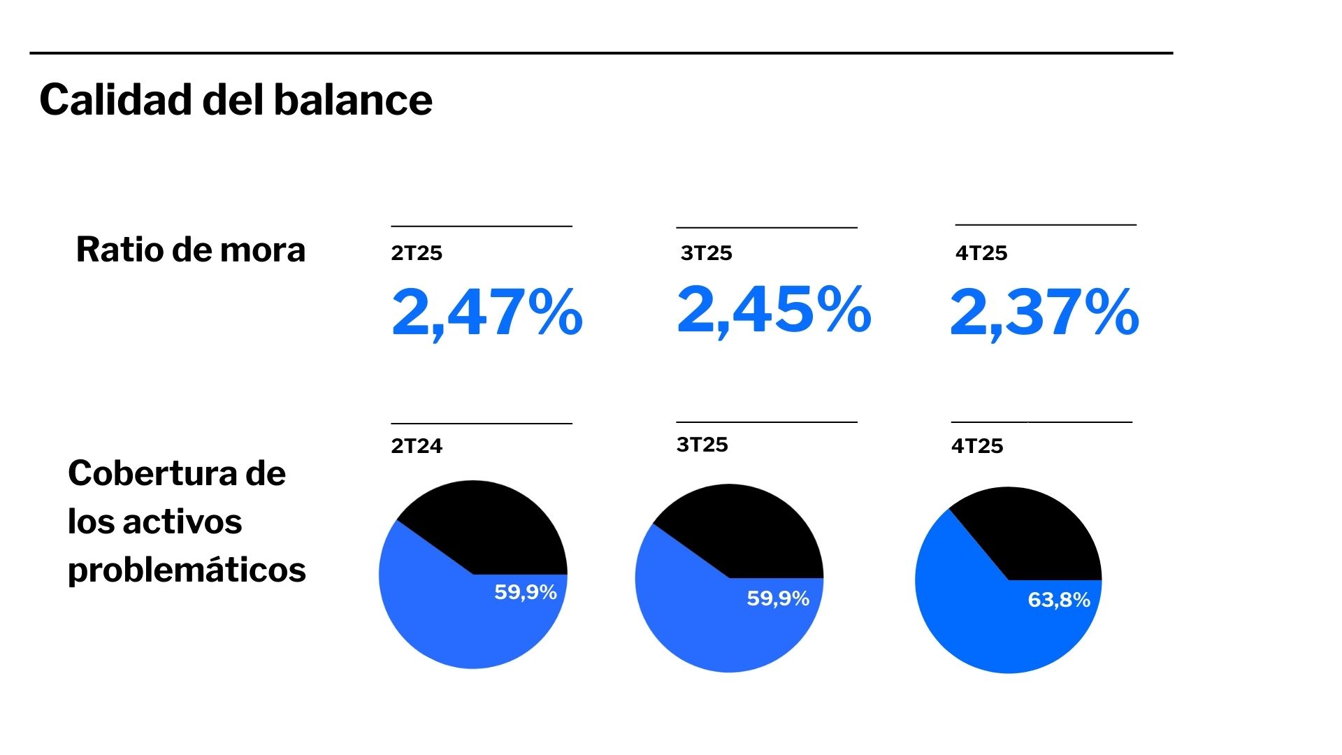 Además, la entidad continúa generando capital de manera recurrente y orgánica a ritmos muy elevados. La ratio CET1 fully-loaded considerando el reparto del exceso de capital se sitúa en el 13,11% a cierre de 2025. La generación de capital ha sido de 20 puntos básicos en el trimestre y de 196 puntos básicos en el año.