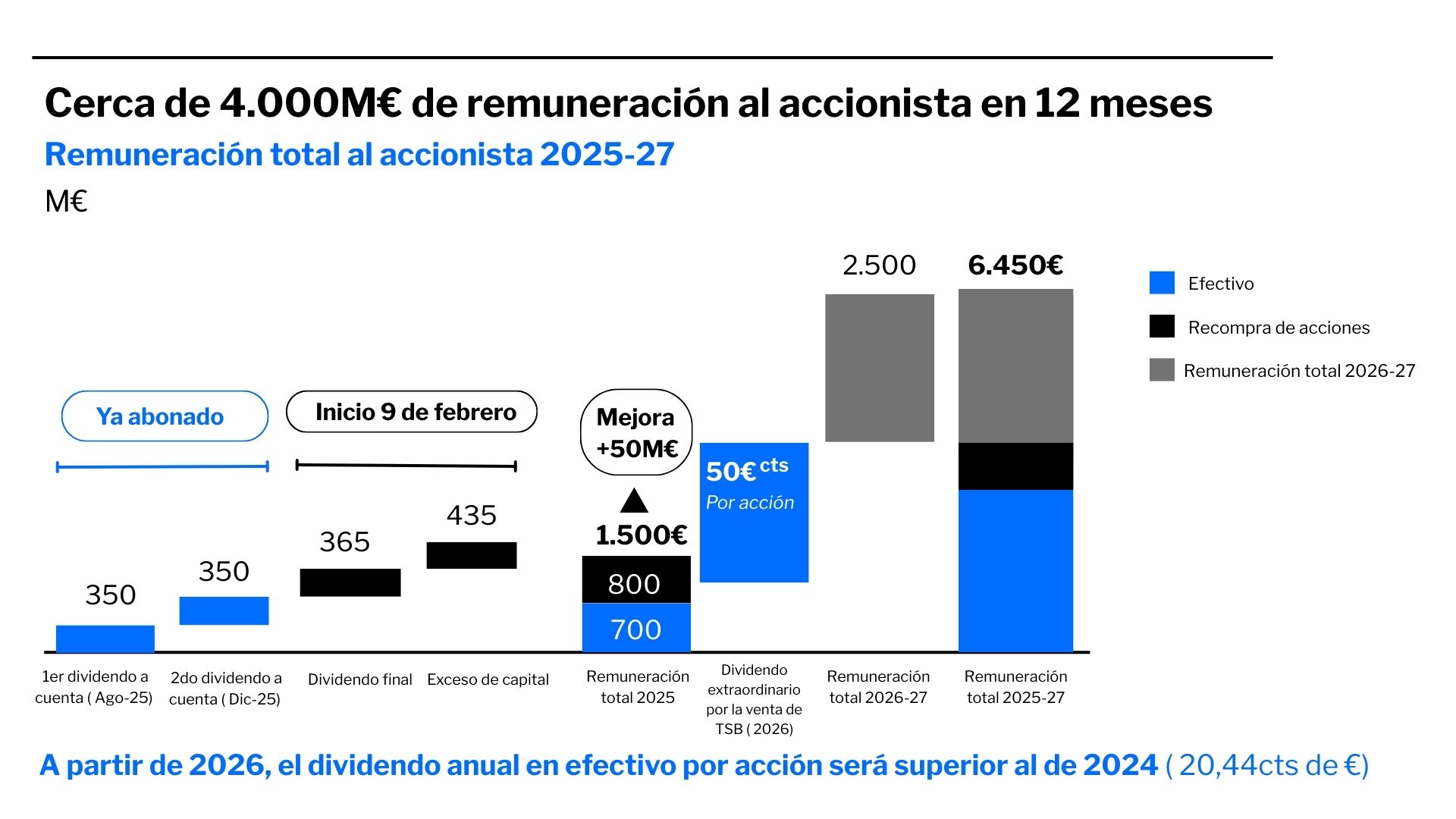 - La entidad remunerará a sus accionistas con 4.000 millones en 12 meses: 700 millones en efectivo a cuenta del ejercicio 2025 ya distribuidos, 800 millones en recompras que empezarán el 9 de febrero y 50 céntimos por acción del dividendo extraordinario de TSB