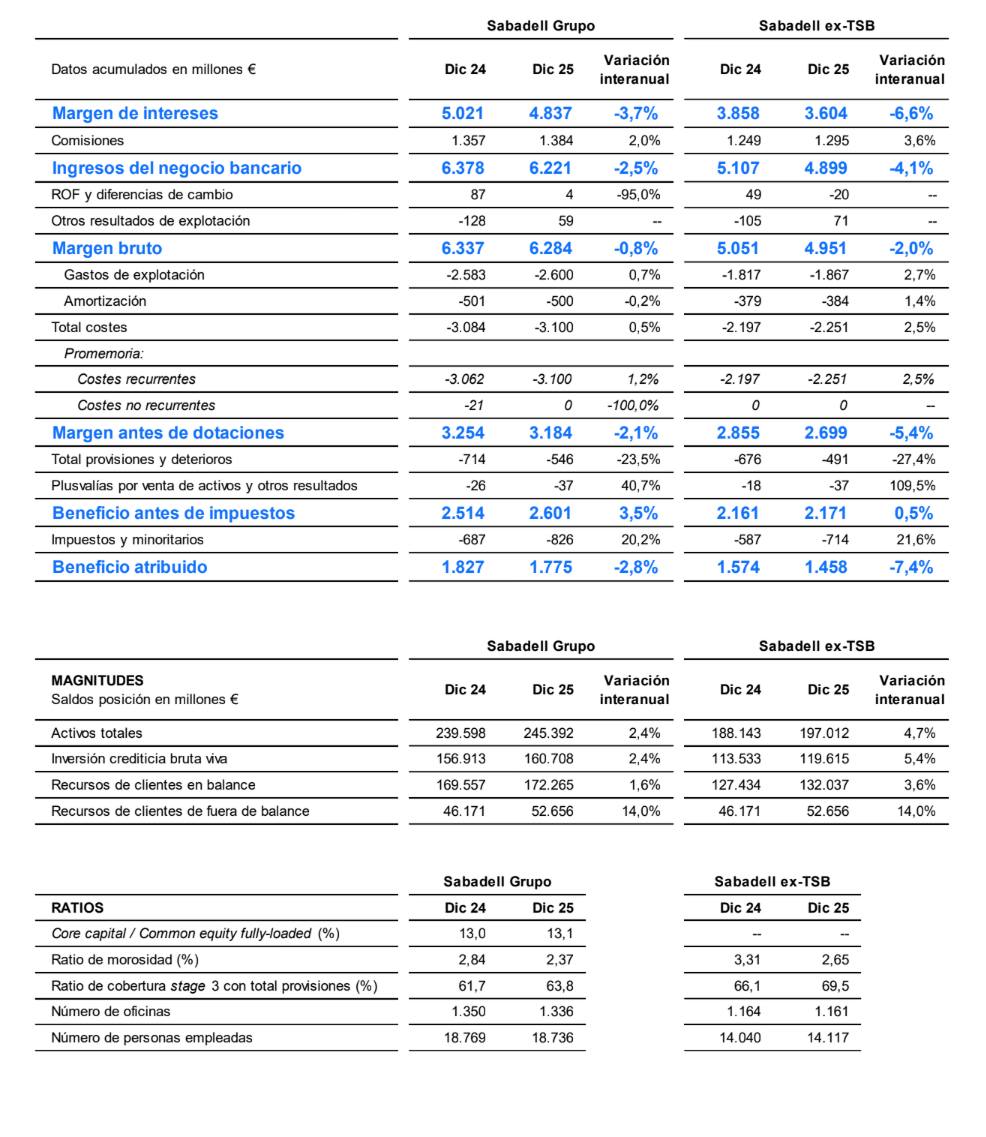 El Grupo Banco Sabadell logró un beneficio neto atribuido de 1.775 millones de euros en el ejercicio 2025 (-2,8% interanual). El beneficio neto de la entidad creció un 3,4% interanual sin tener en cuenta los extraordinarios de 2024, apoyado en la mejora de la calidad de los activos y la reducción de las provisiones, así como en el fuerte impulso de los volúmenes de crédito y recursos en España.
