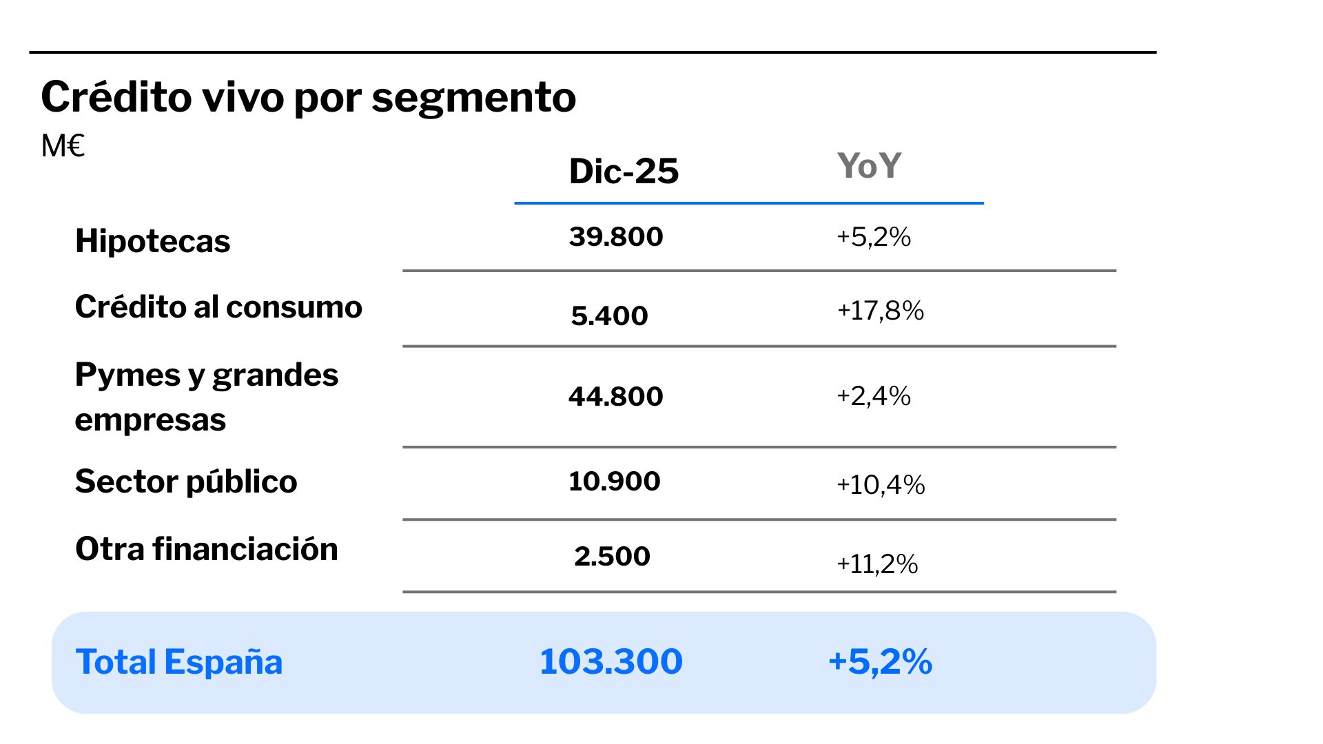 Para 2026, las previsiones de la entidad apuntan a un RoTE recurrente del 14,5% (exTSB) y un margen de intereses que crecerá a un ritmo superior al 1%, mientras que estima una subida de un dígito medio en la línea de las comisiones y un incremento de los costes del 3%, mientras el coste de riesgo total se sitúa en torno a los 40 puntos básicos.
